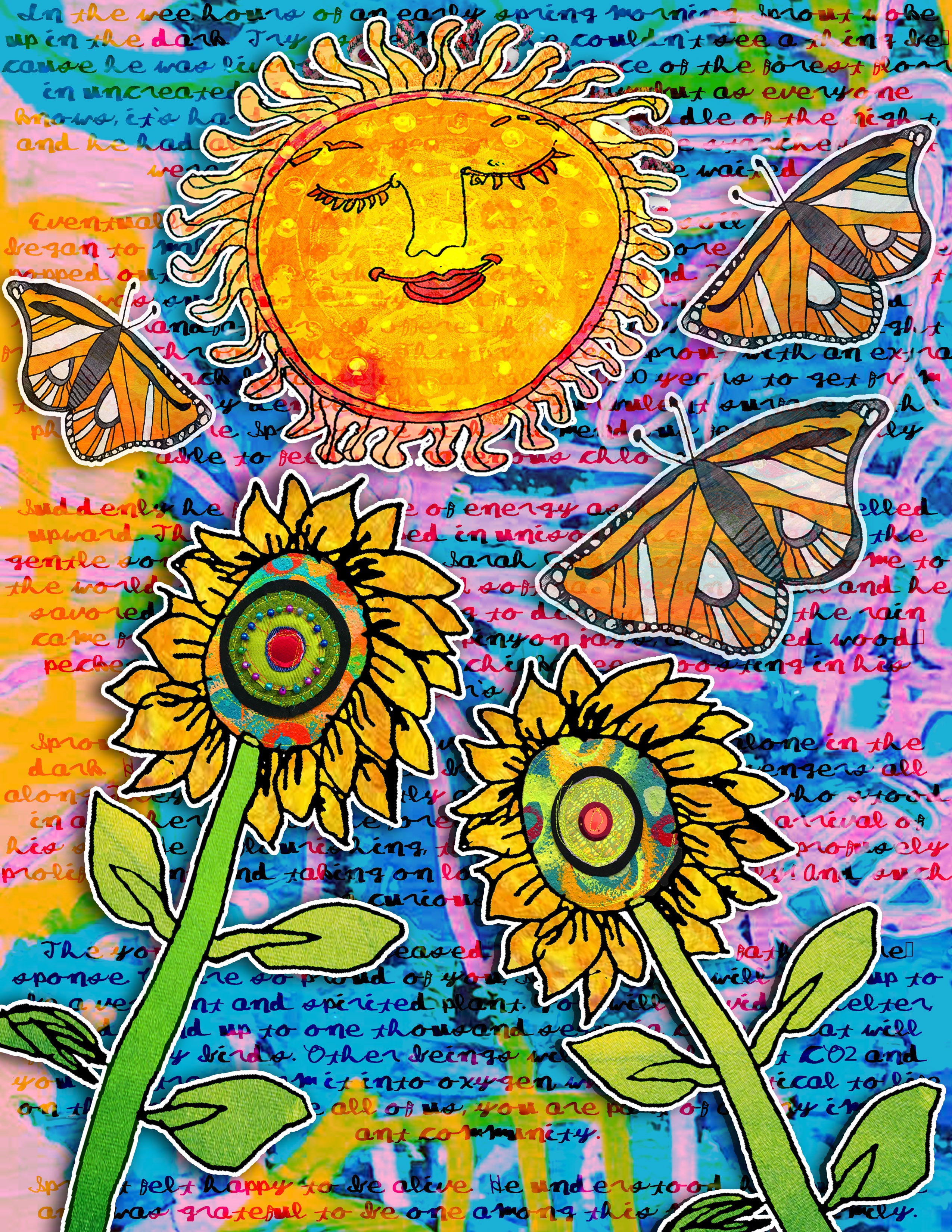 Monarch butterflies represent solar energy through its reliance on the warmth of the sun to "charge" its wings. As the butterfly absorbs the sun's heat, it activates the muscles in its wings, enabling it to fly long distances during migration. The solar energy warms its body and powers its movements, symbolizing how solar energy directly supports the butterfly's ability to travel, survive, and connect with the plants it relies on, like sunflowers. This imagery highlights the way the sun provides not just sustenance for plants, but also the energy that enables animals like the monarch to thrive and continue their life cycle.